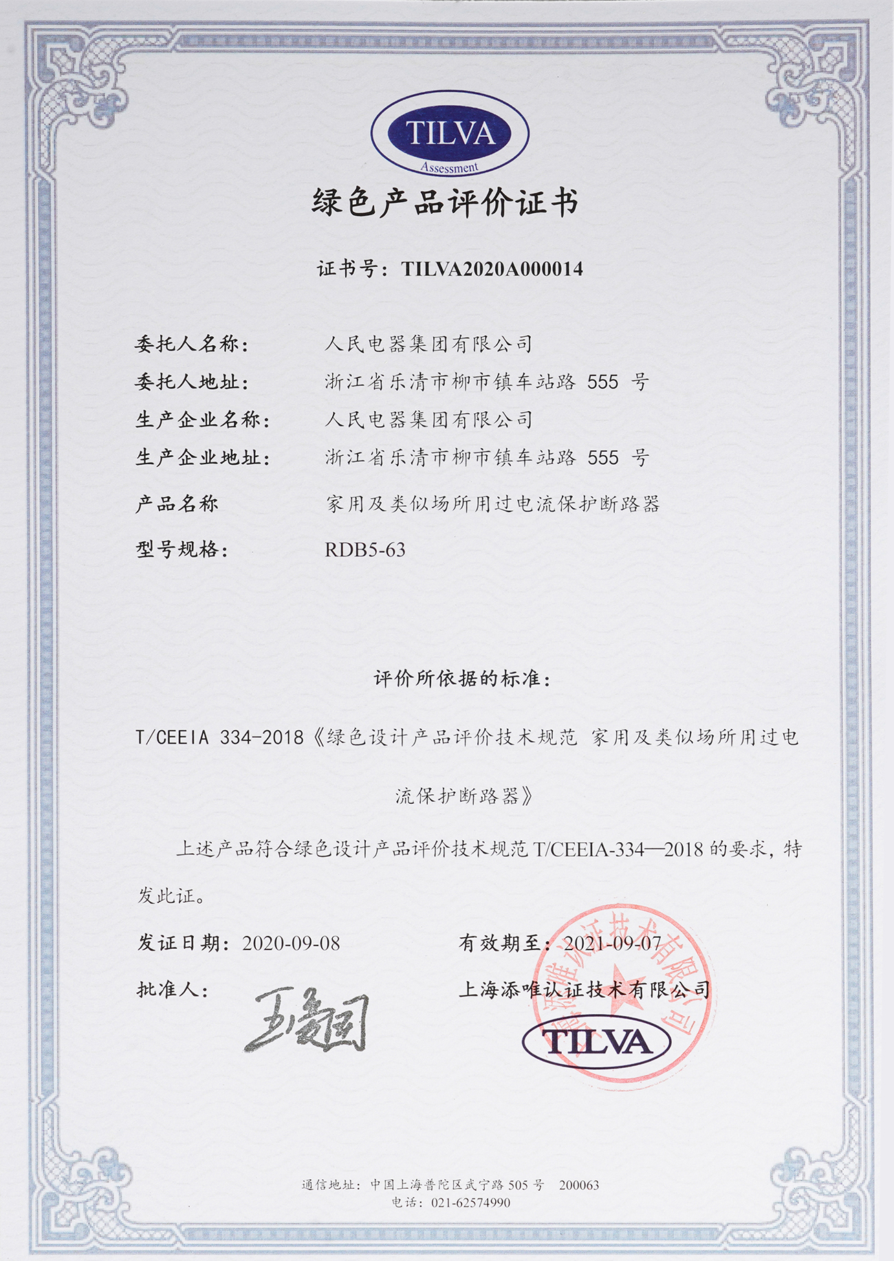 绿色产品评价证书:家用及类似场所用过电流保护断路器RDB5-63(证书编号:TILVA2020A000014)(点击下载)