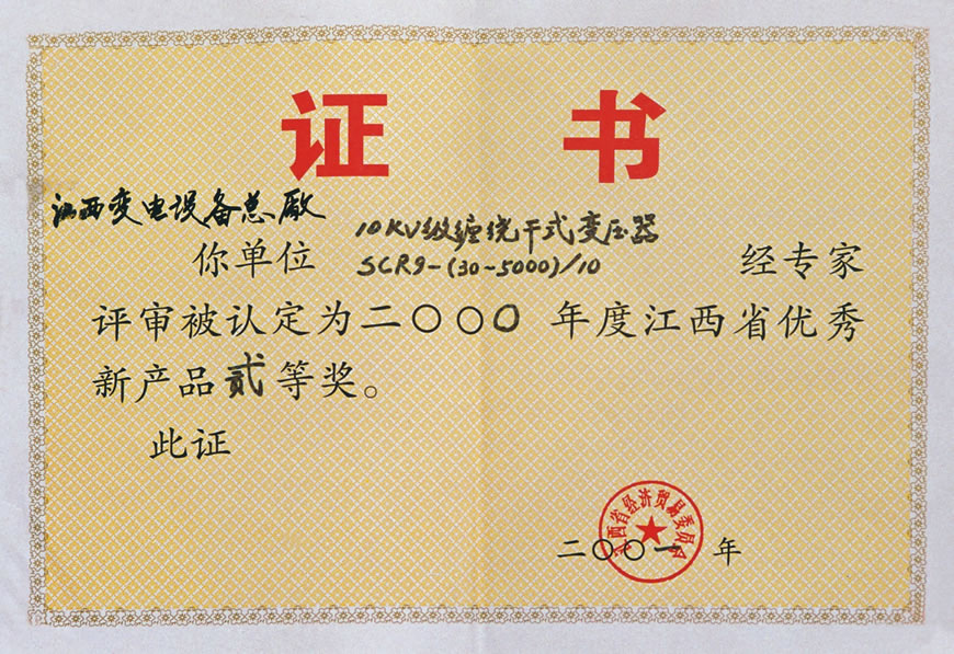 江西省优秀新产品二等奖:10KV级缠绕干式变压器SCR9-(30-5000)/10(点击下载)
