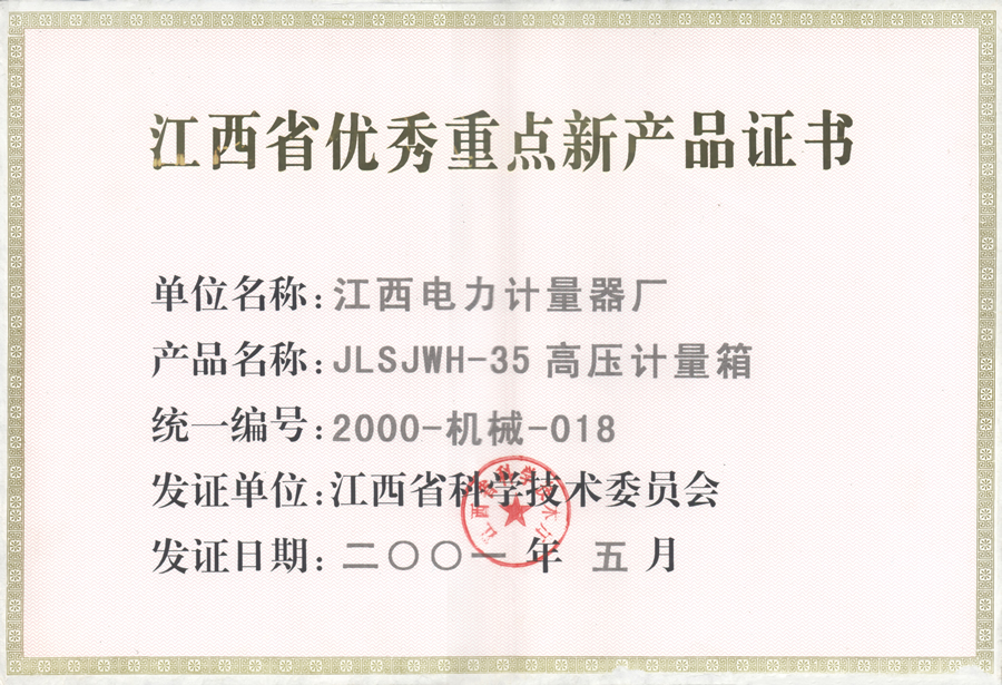 江西省优秀重点新产品证书:JLSJWH-35高压计量箱(点击下载)