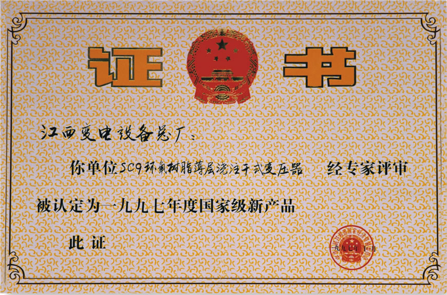 国家级新产品证书:SC9环氧树脂薄层浇注干式变压器(点击下载)