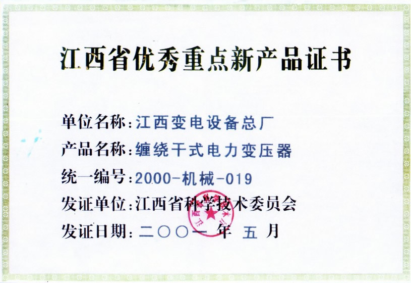 江西省优秀重点新产品证书:缠绕干式电力变压器(点击下载)