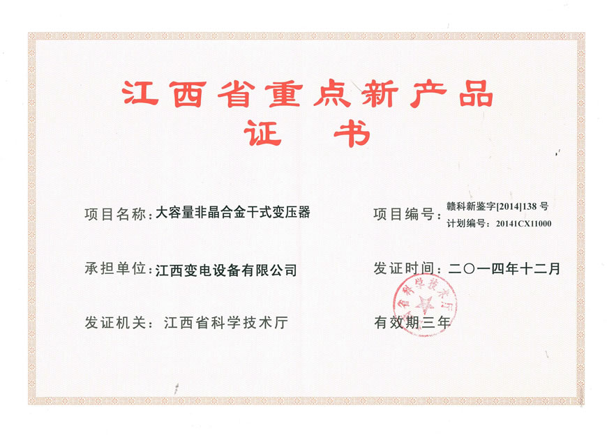 江西省重点新产品证书:大容量非晶合金干式变压器(点击下载)