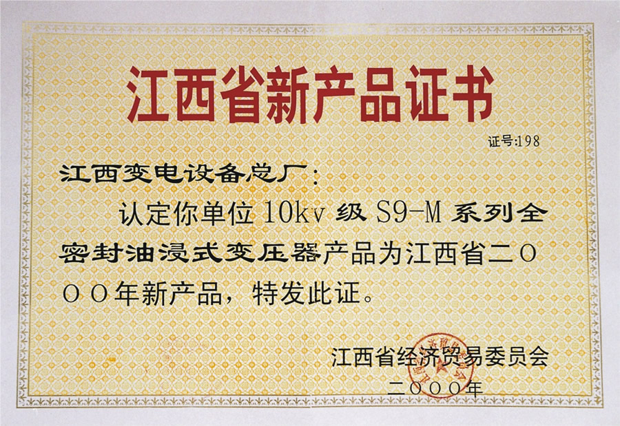 江西省新产品证书:10KV级S9-M系列全密封油浸式变压器(点击下载)