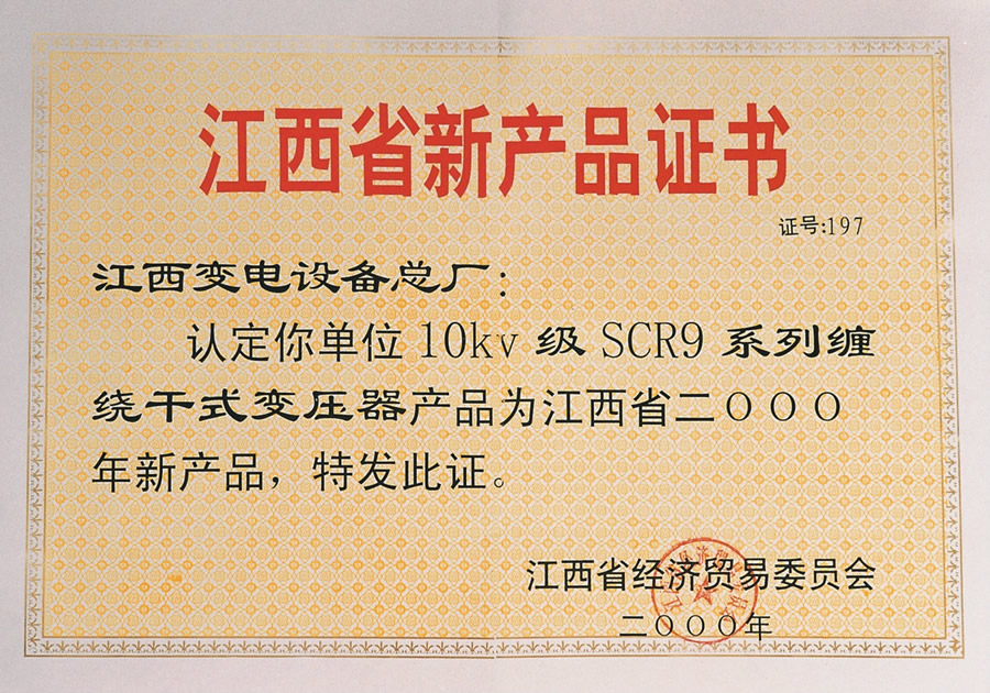 江西省新产品证书:10KV级SCR9系列缠绕干式变压器(点击下载)