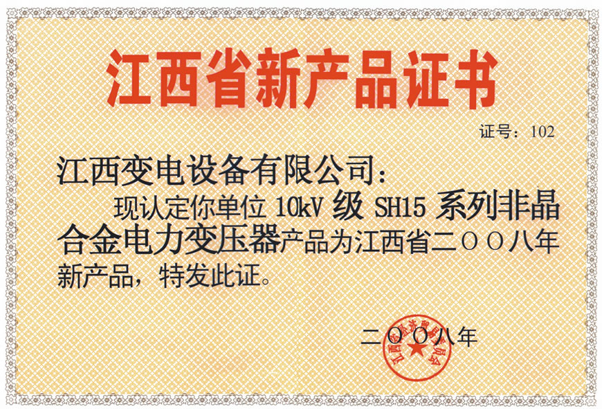 江西省新产品证书:10KV级SH15系列非晶合金电力变压器(点击下载)