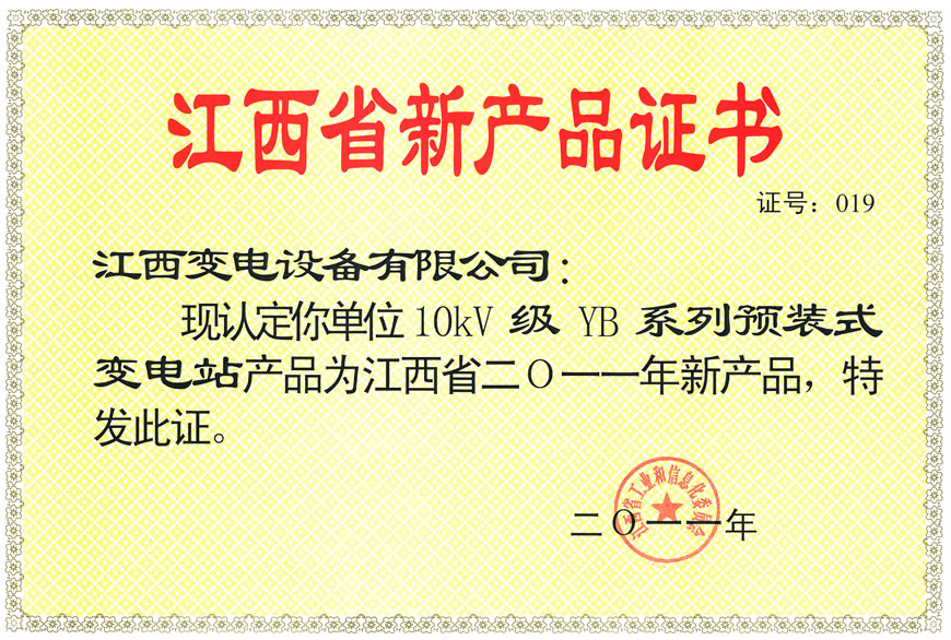 江西省新产品证书:10KV级YB系列预装式变电站(点击下载)