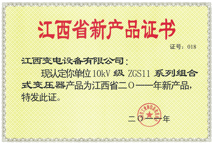 江西省新产品证书:10KV级ZGS11系列组合式变压器(点击下载)