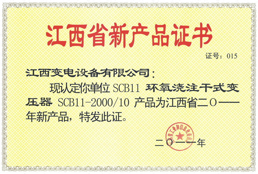 江西省新产品证书:SCB11-2000/10环氧绕注干式变压器(点击下载)