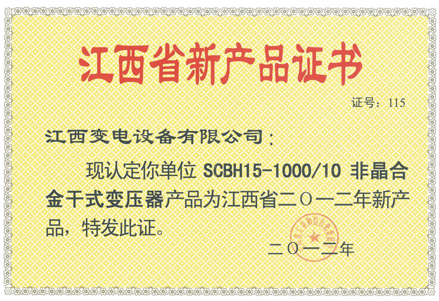 江西省新产品证书:SCBH15-1000/10非晶合金干式变压器(点击下载)