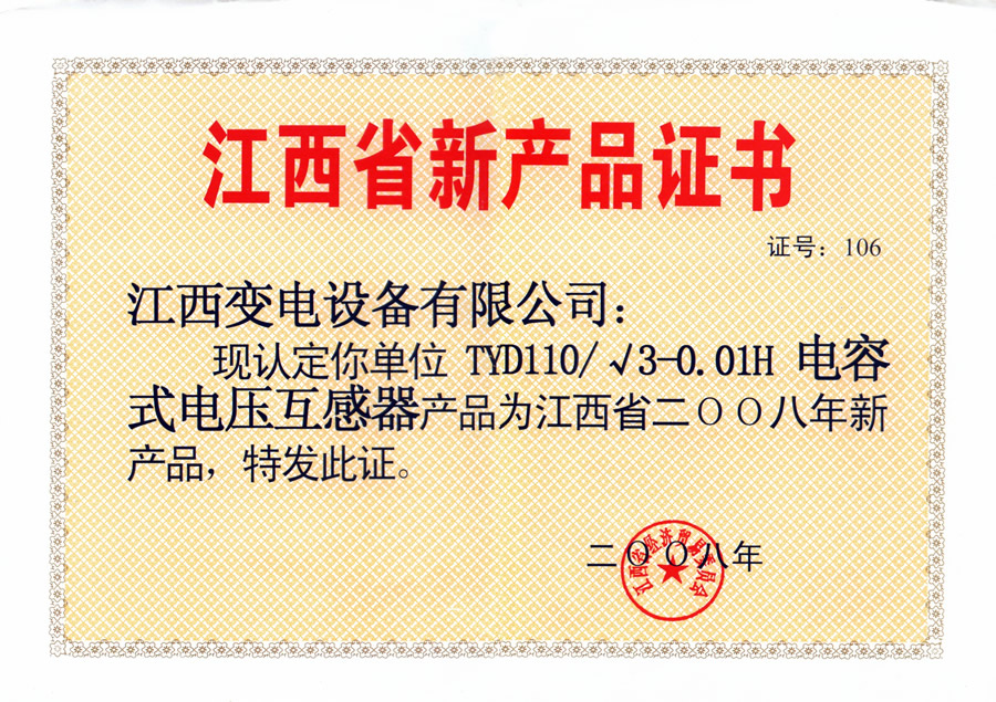 江西省新产品证书:TYD110/√3-0.01H电容式电压互感器(点击下载)