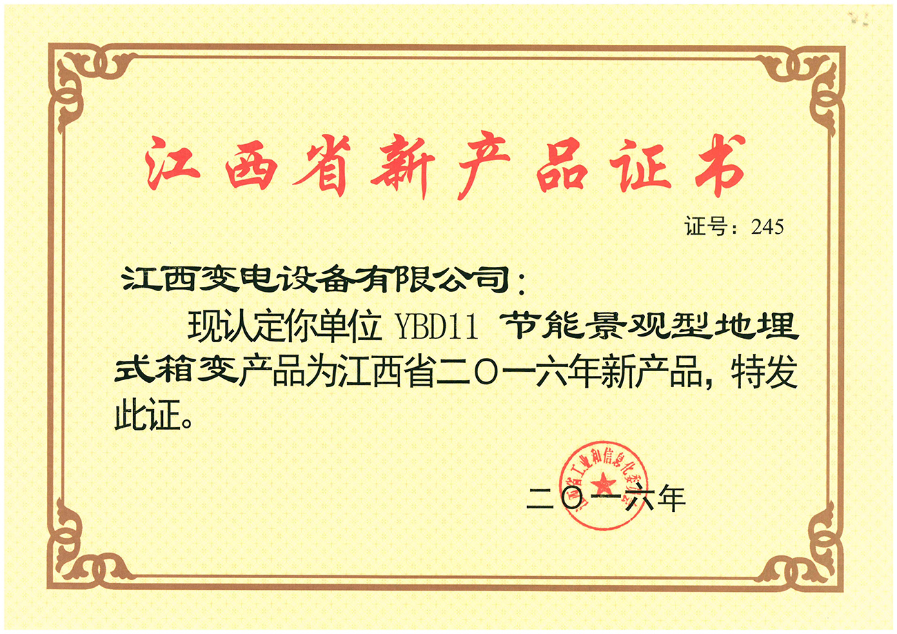 江西省新产品证书:YBD11节能观景型地埋式箱变(点击下载)