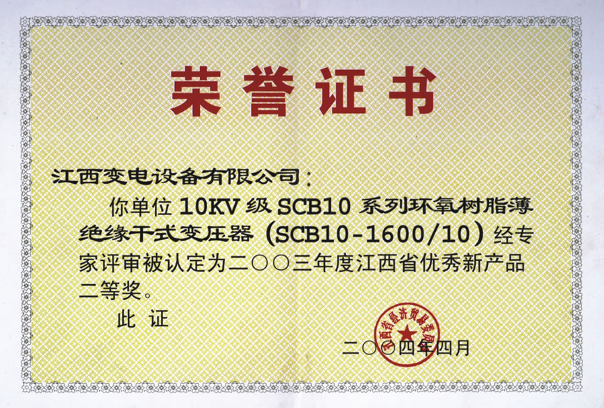 江西省优秀新产品二等奖:10KV级SCB10系列环氧树脂薄绝缘干式变压器(点击下载)