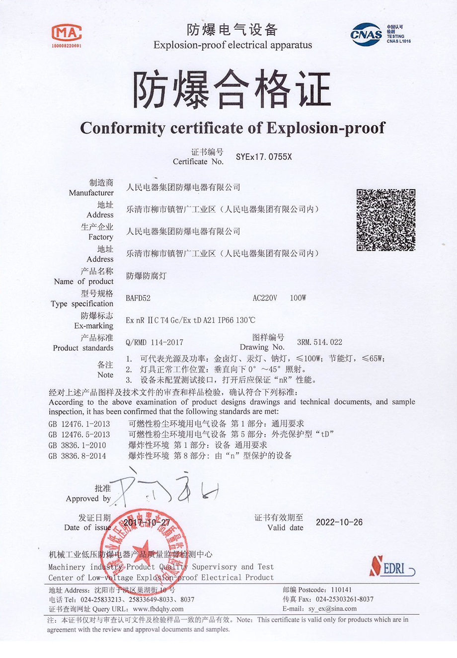 防爆合格证:BAFD52 AC220V 100W防爆防腐灯(点击下载)