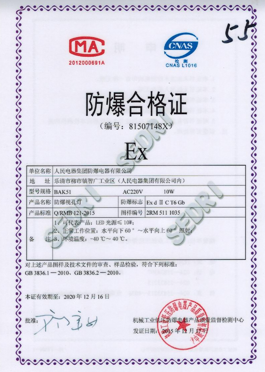 防爆合格证:BAK51 AC220V 10W防爆视孔灯(点击下载)