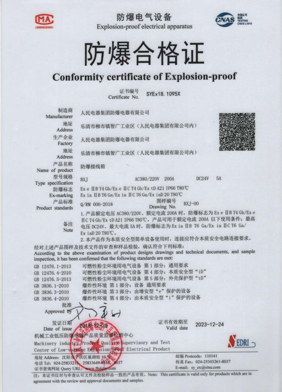 防爆合格证:BXJ AC380/220V 200A DC24V 5A 防爆接线箱(点击下载)
