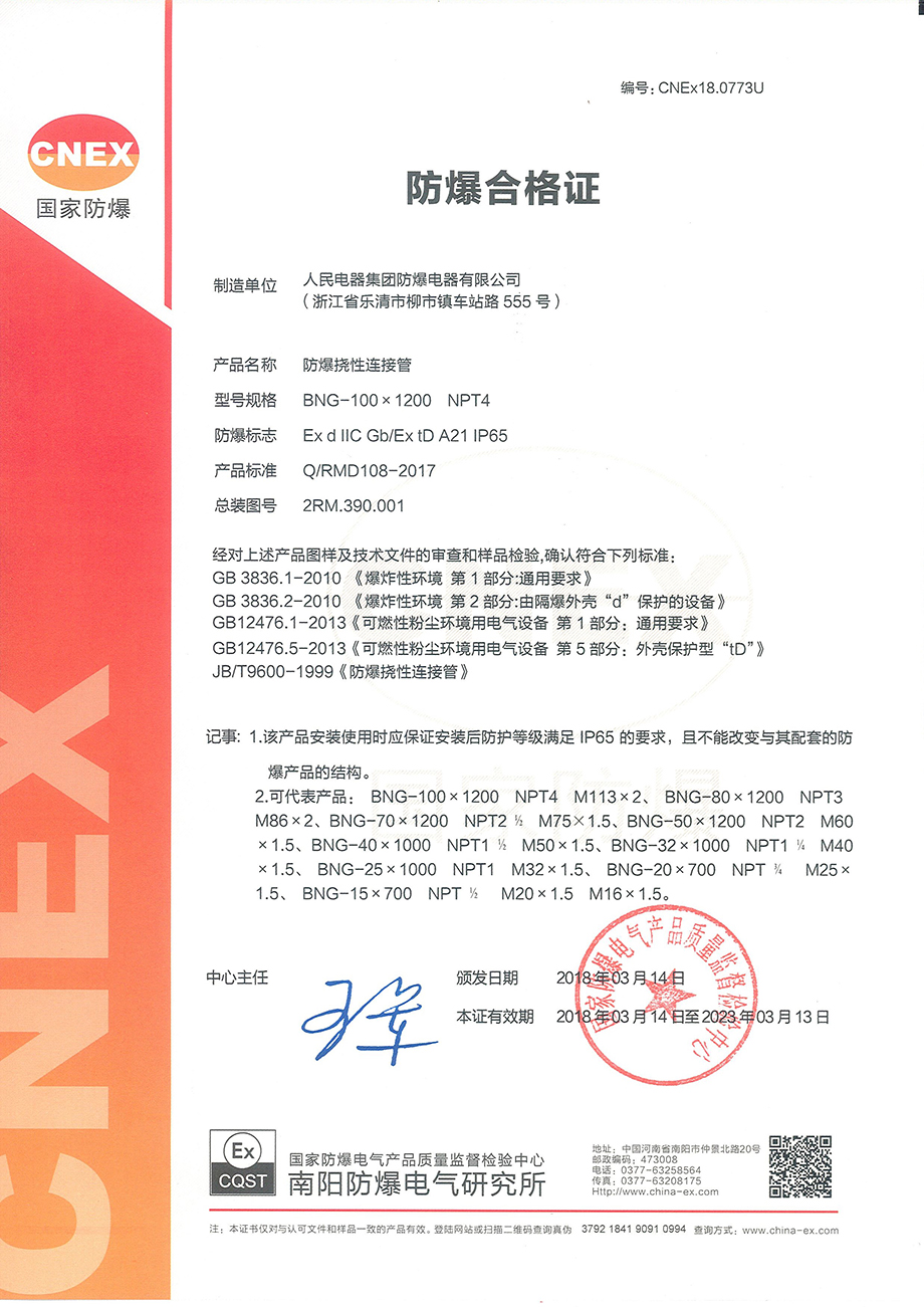 防爆合格证:BNG-100x1200 NPT4 防爆挠性连接管(点击下载)