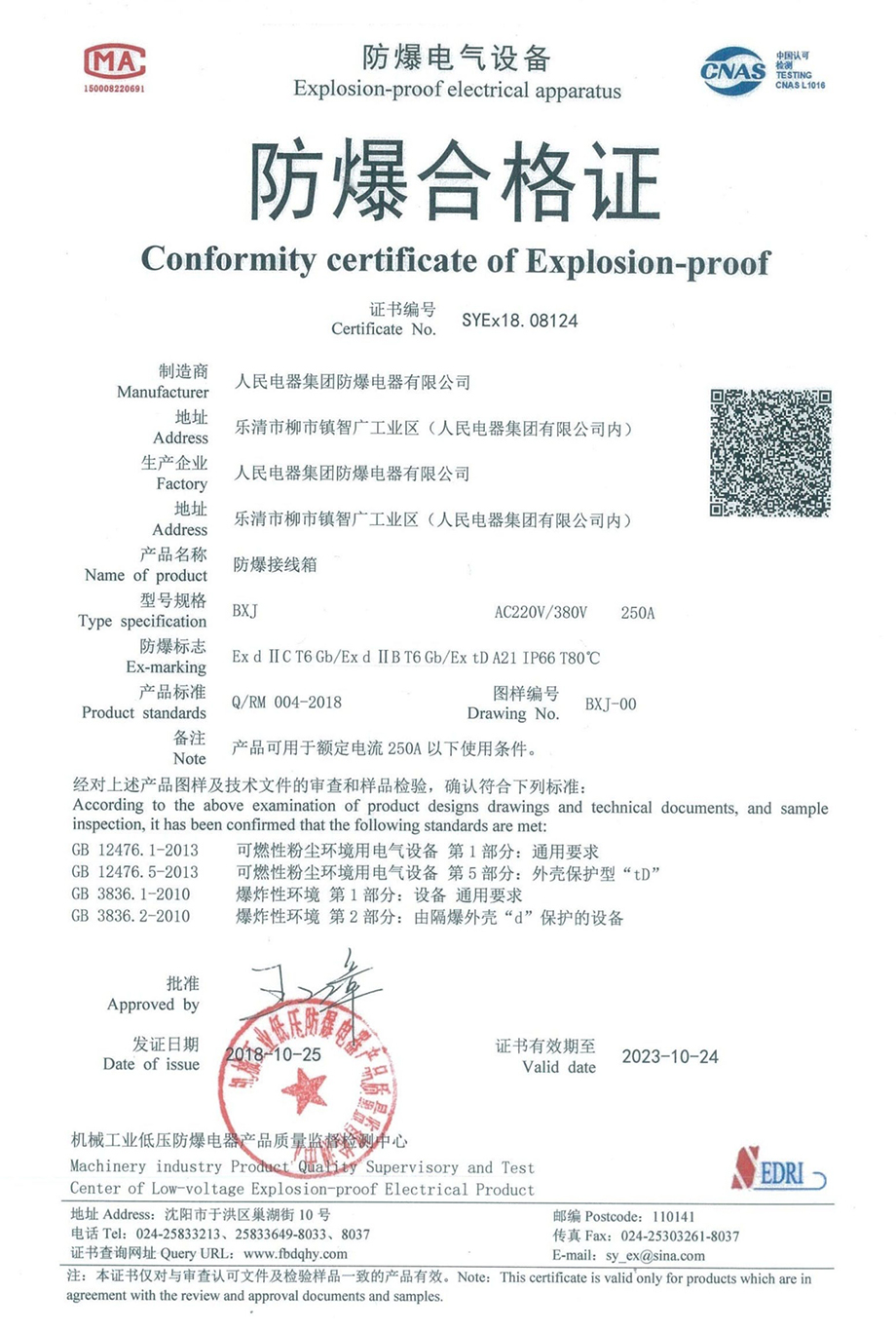 防爆合格证:BXJ AC380V/AC220V 250A 防爆接线箱(点击下载)