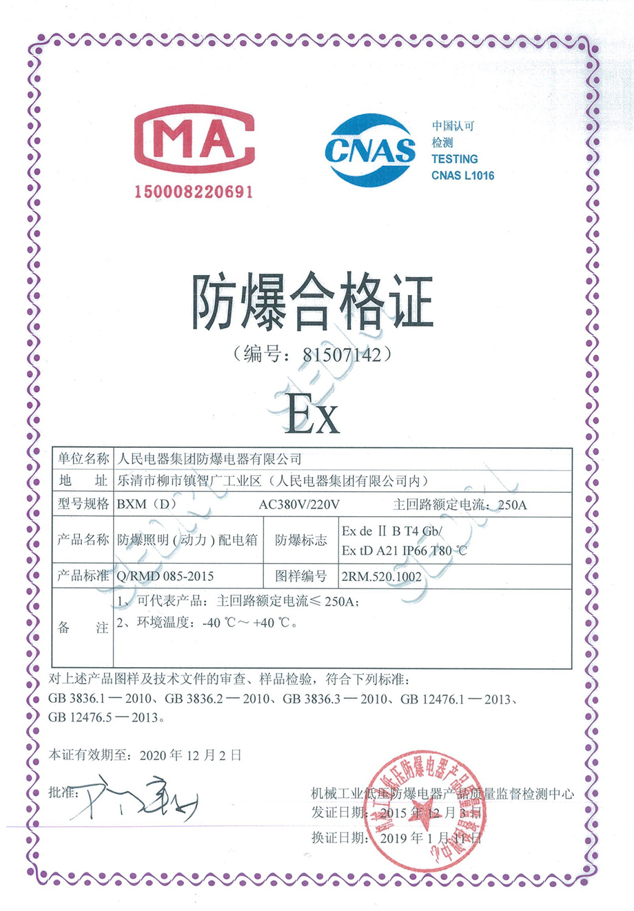 防爆合格证:BXM(D) AC380V/220V 250A防爆照明(动力)配电箱(点击下载)