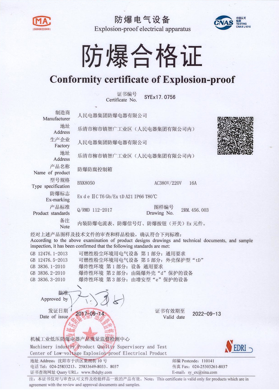 防爆合格证:BXK8050 AC380V/220V 16A防爆防腐控制箱(点击下载)