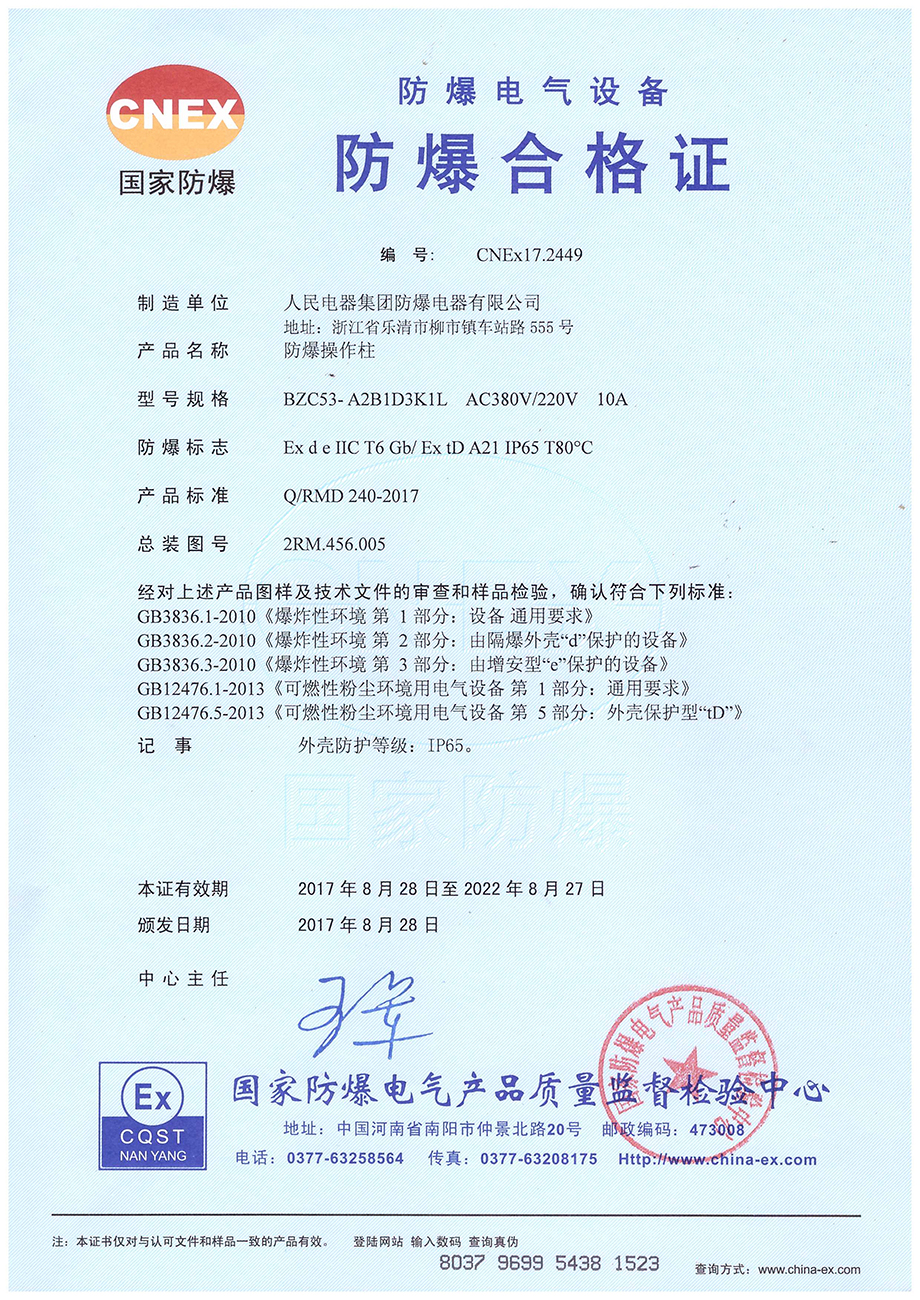 防爆合格证:BZC53-A2B1D3K1L AC380V/220V 10A防爆操作柱(点击下载)