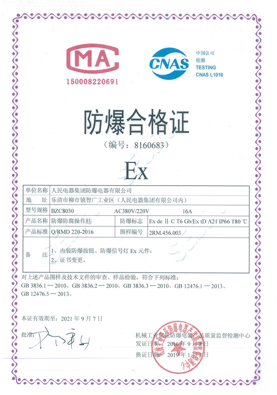防爆合格证:BZC8030 AC380V/220V 16A防爆防腐操作柱(点击下载)