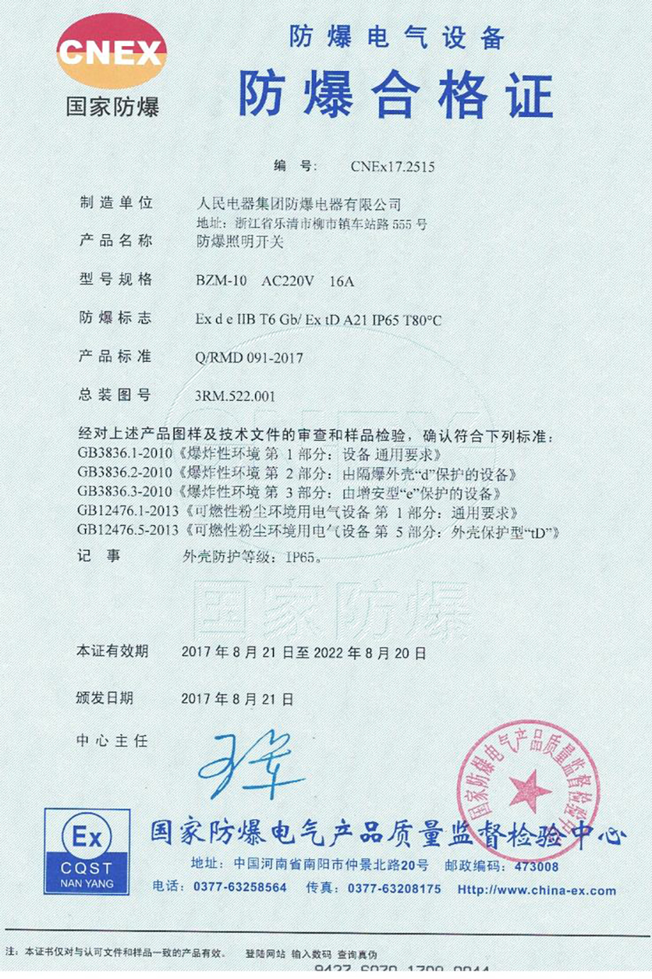 防爆合格证:BZM-10 AC220V 16A防爆照明开关(点击下载)