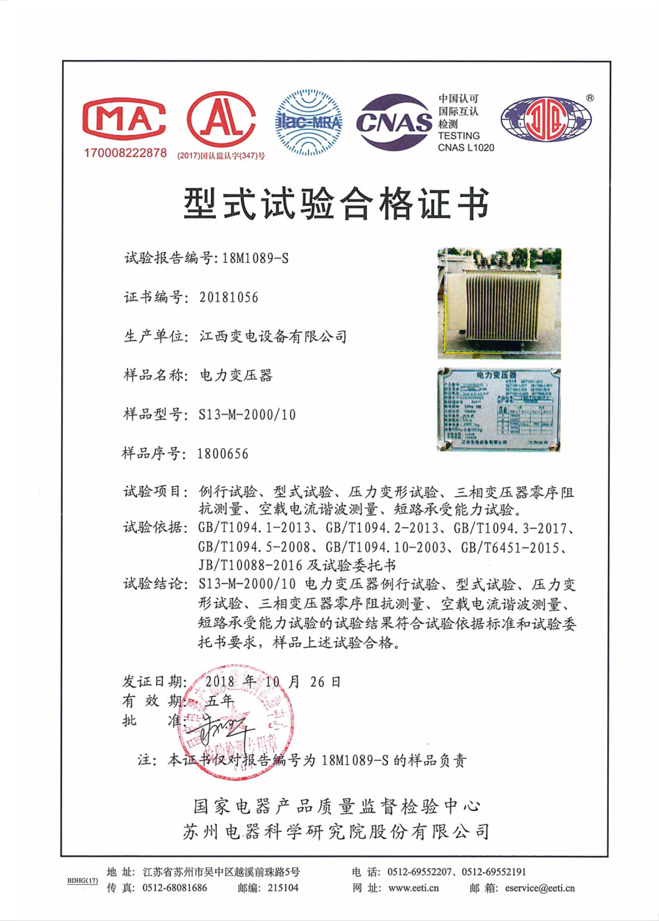 型式试验合格证书:S13-M-2000/10电力变压器(点击下载)
