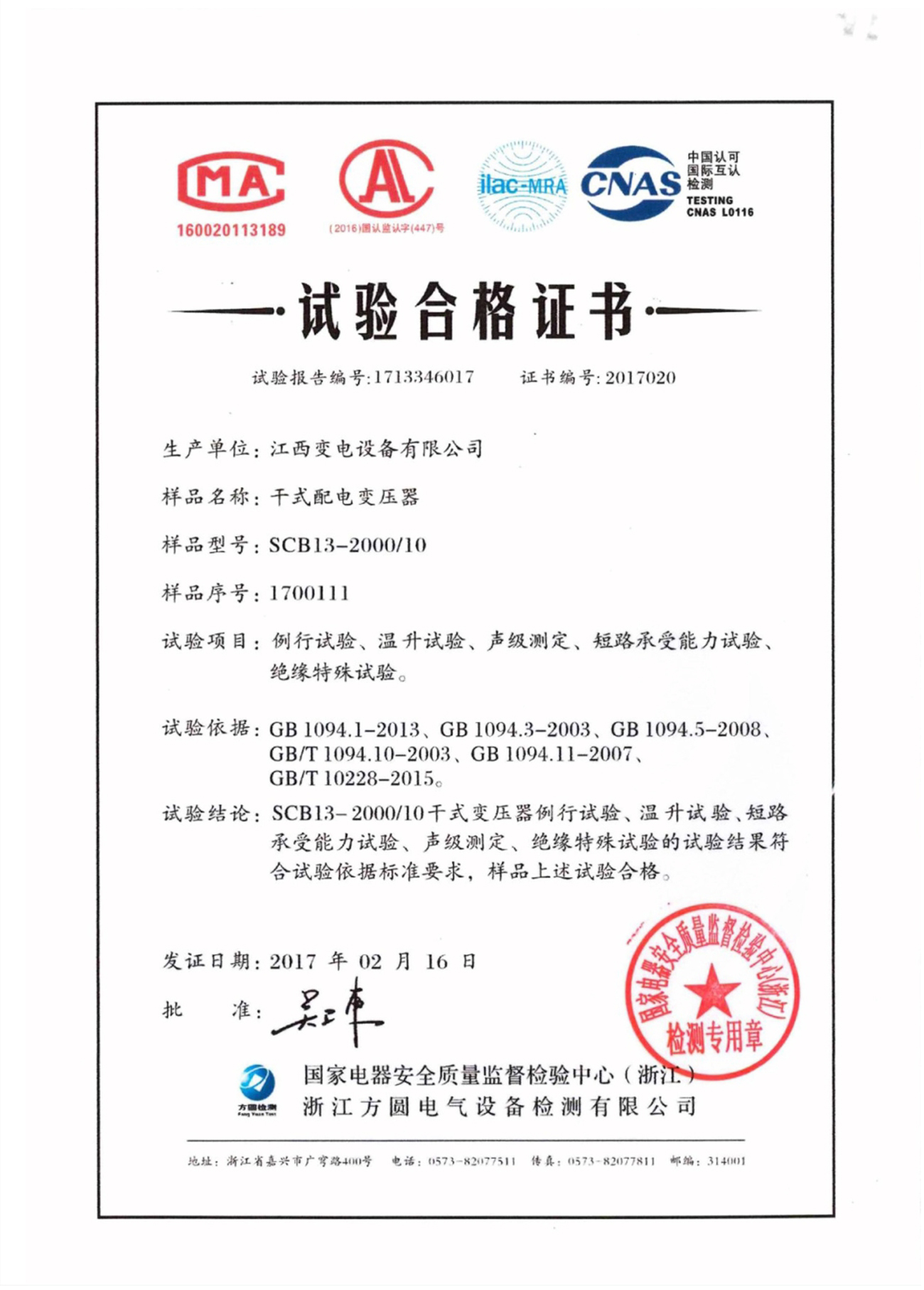 试验合格证书:SCB13-2000/10 干式配电变压器(点击下载)