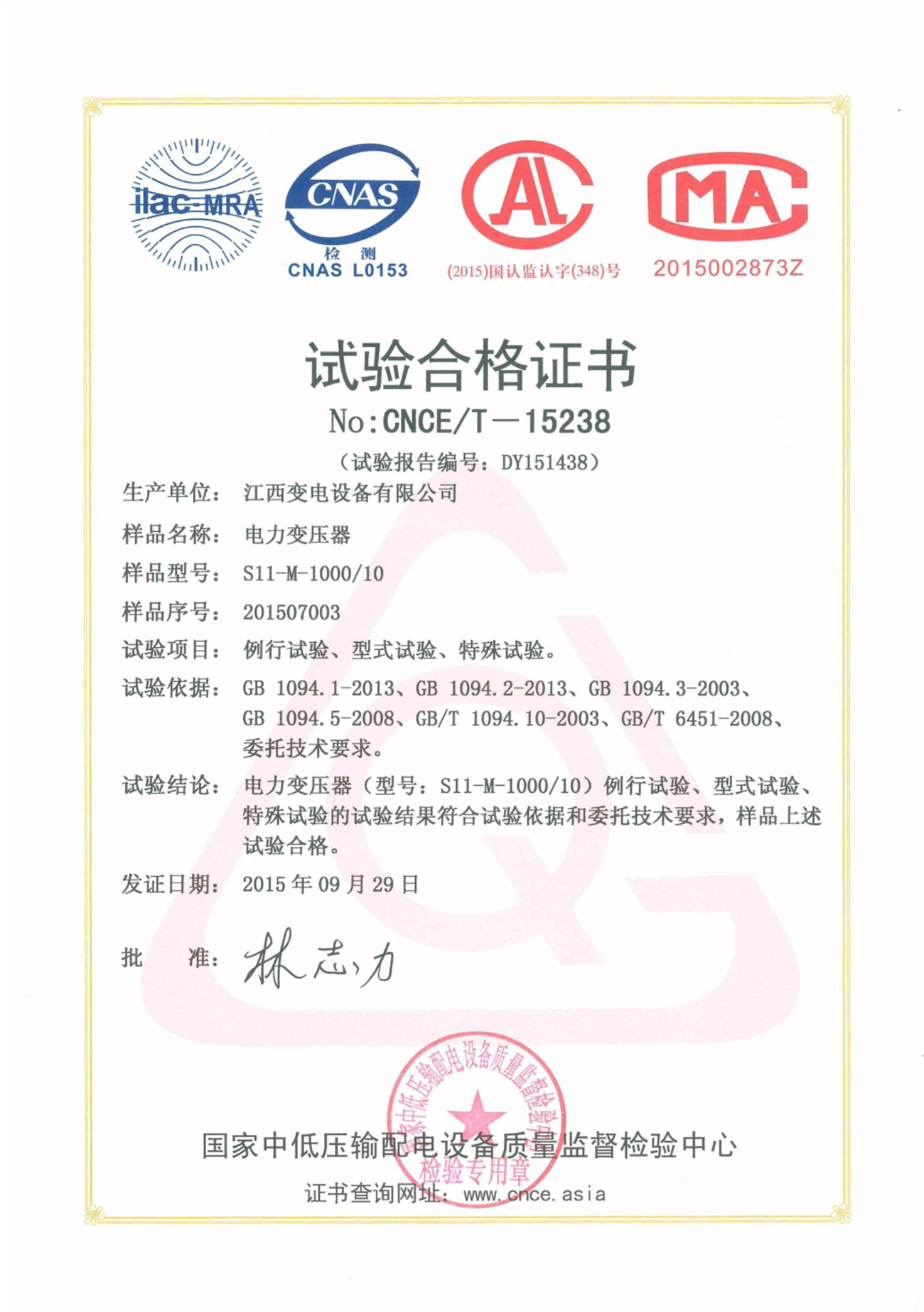 试验合格证书:S11-M-1000/10电力变压器(点击下载)
