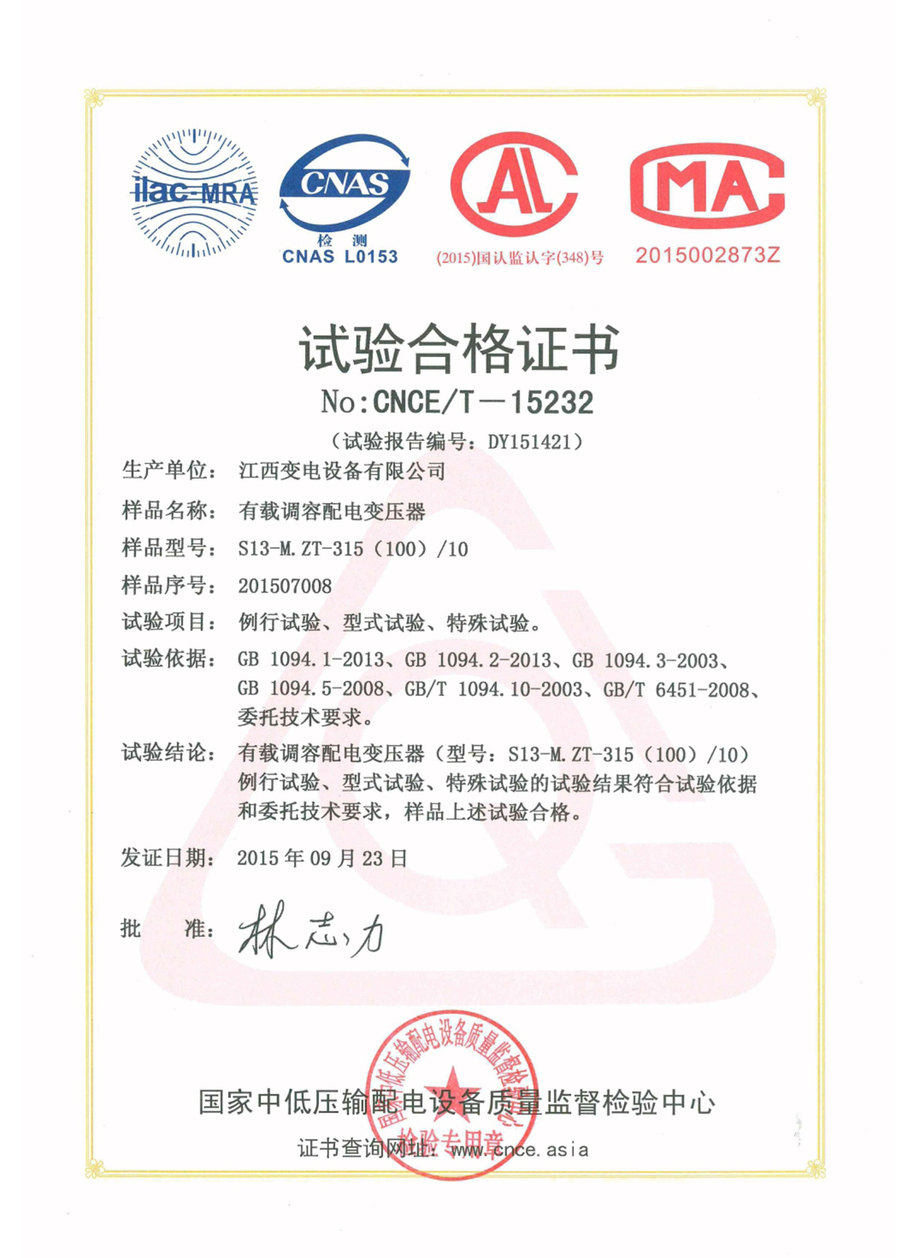 试验合格证书:S13-M.ZT-315(100)/10有载调容配电变压器(点击下载)
