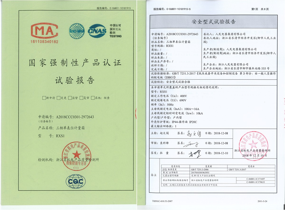 CCC试验报告(201812):RXS1三相单表位计量箱(点击下载)