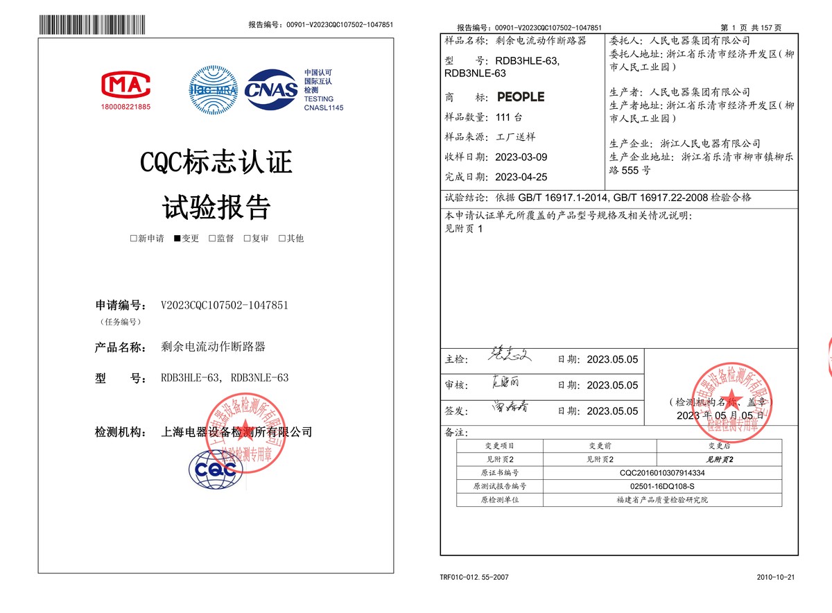 CQC试验报告(202305):RDB3HLE-63,RDB3NLE-63剩余电流动作断路器(点击下载)
