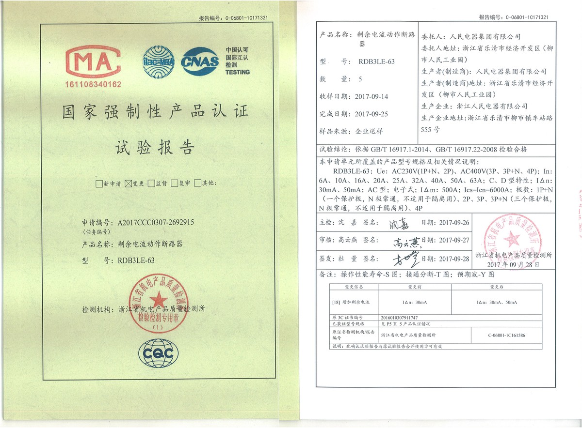 CCC试验报告(201709):RDB3LE-63剩余电流动作断路器(点击下载)