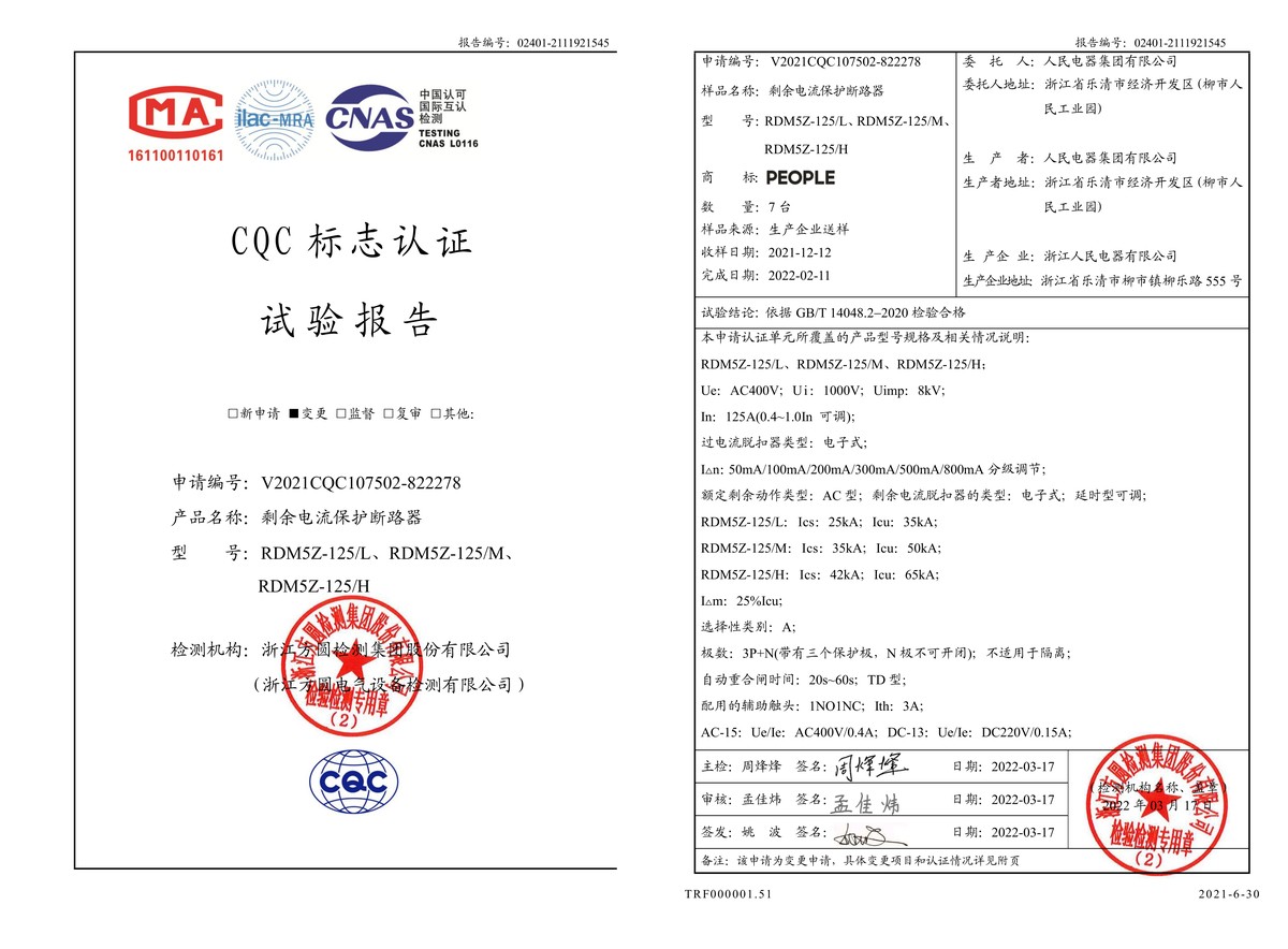 CQC试验报告(202203):RDM5Z-125/L,RDM5Z-125/M,RDM5Z-125/H剩余电流?;ざ下菲鳎ǖ慊飨略?