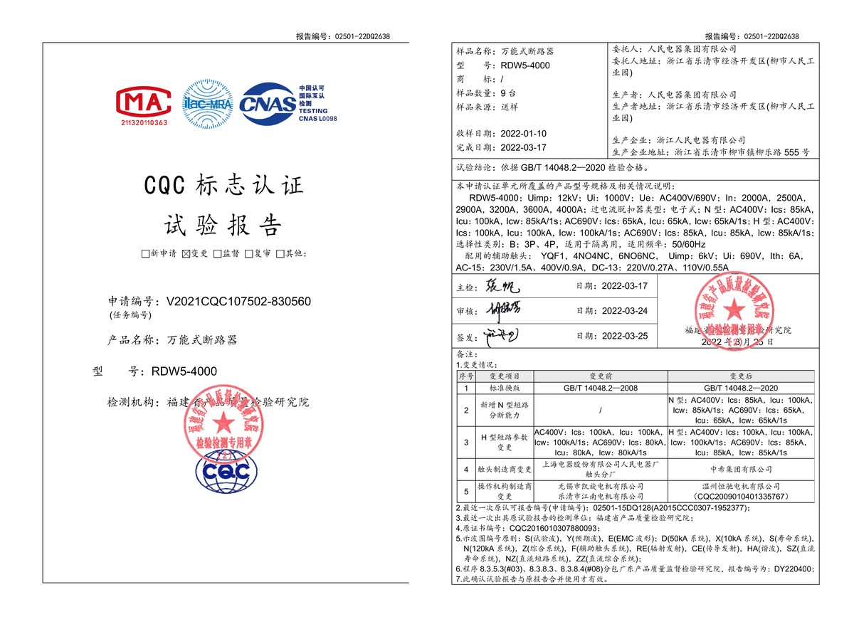 CQC试验报告(202203):RDW5-4000万能式断路器(点击下载)