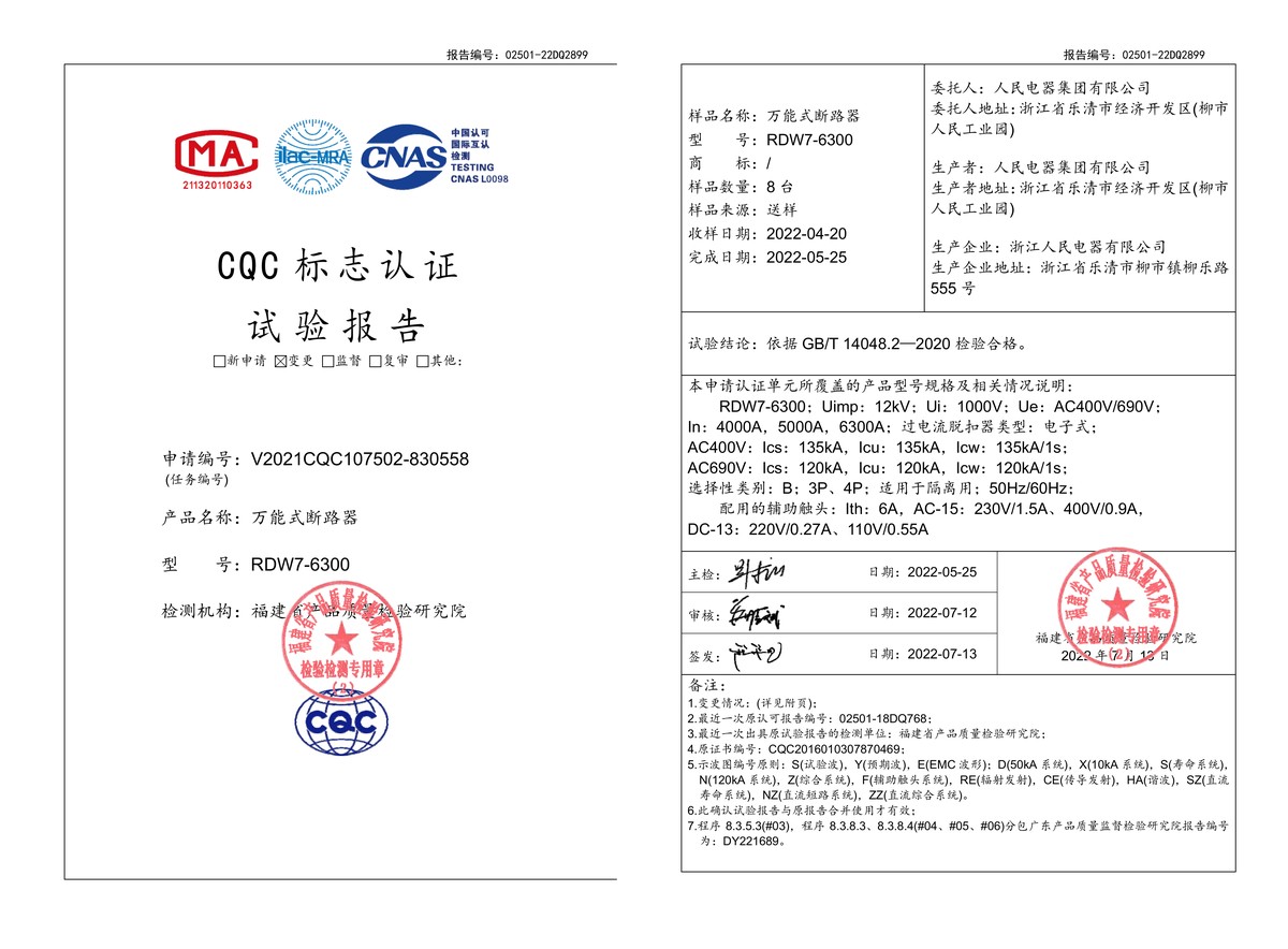 CQC试验报告(202207):RDW7-6300万能式断路器(点击下载)