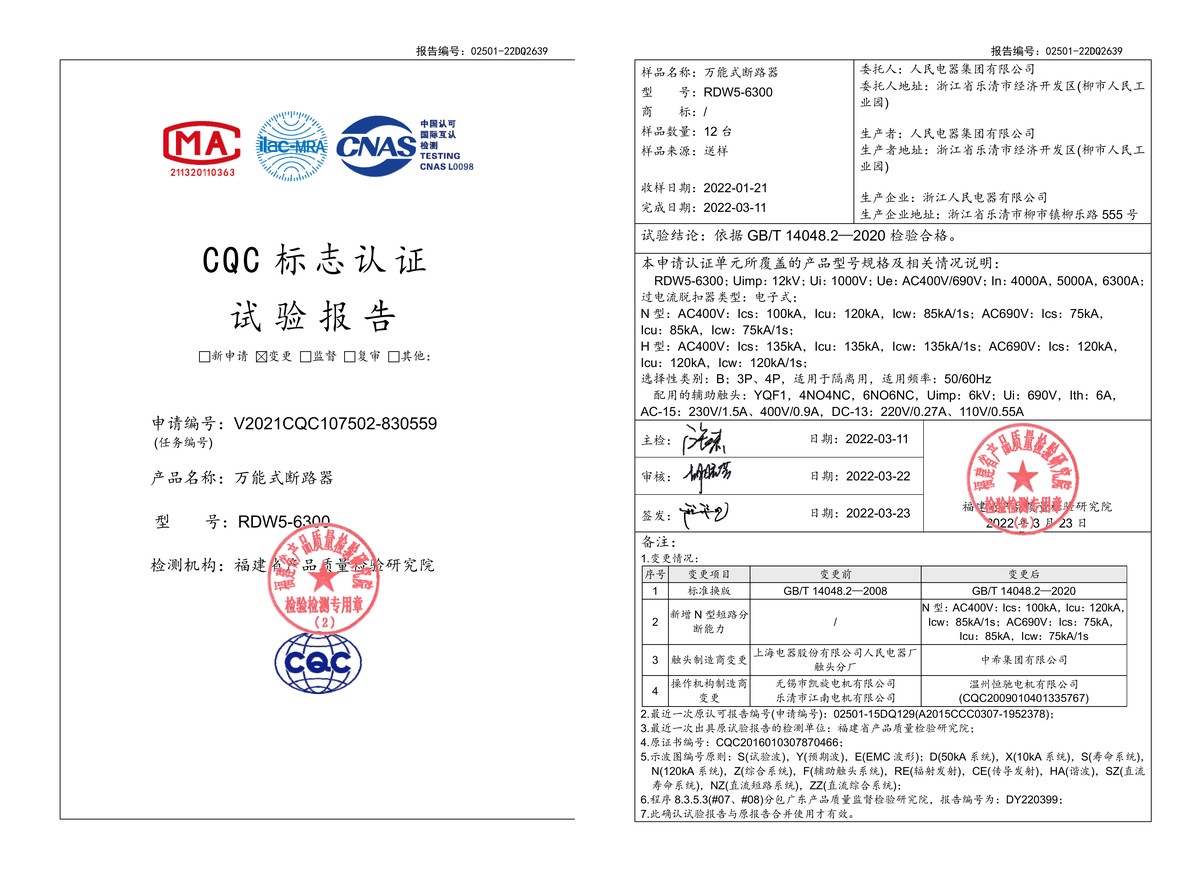 CQC试验报告(202203):RDW5-6300万能式断路器(点击下载)
