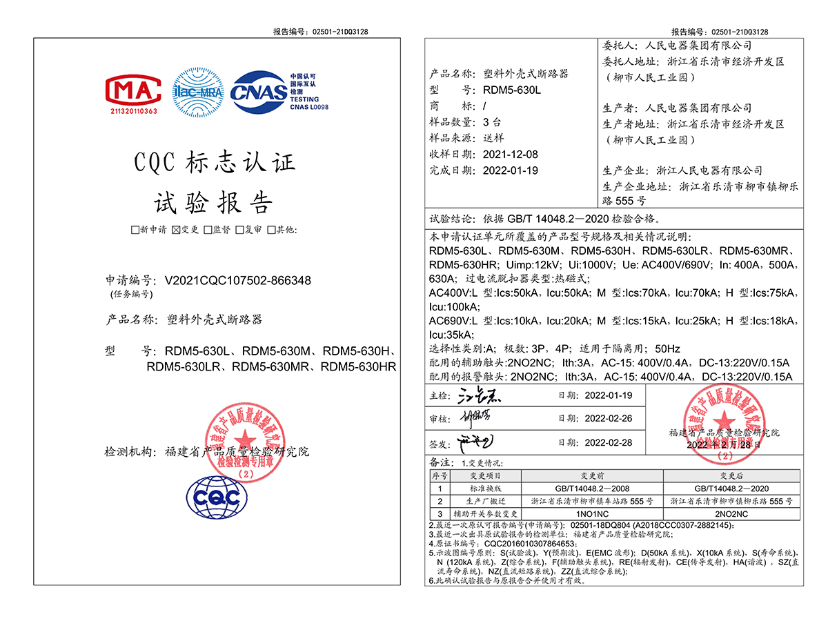 CQC试验报告(202202):RDM5-630L,RDM5-630M,RDM5-630H,RDM5-630LR,RDM5-630MR,RDM5-630HR塑料外壳式断路器(点击下载)