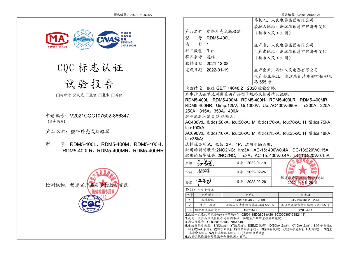 CQC试验报告(202202):RDM5-400L,RDM5-400M,RDM5-400H,RDM5-400LR,RDM5-400MR,RDM5-400HR塑料外壳式断路器(点击下载)