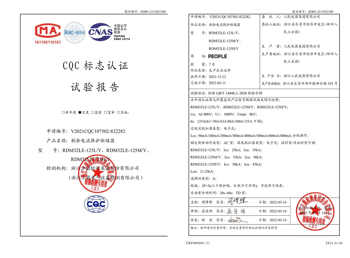 CQC试验报告(202203):RDM32LE-125L,RDM32LE-125M,RDM32LE-125H剩余电流动作断路器(点击下载)
