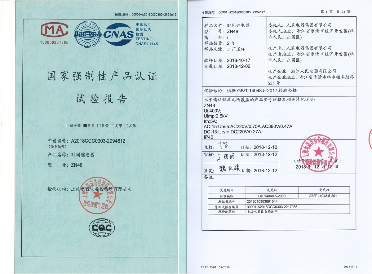 CCC试验报告(201812):ZN48时间继电器(点击下载)