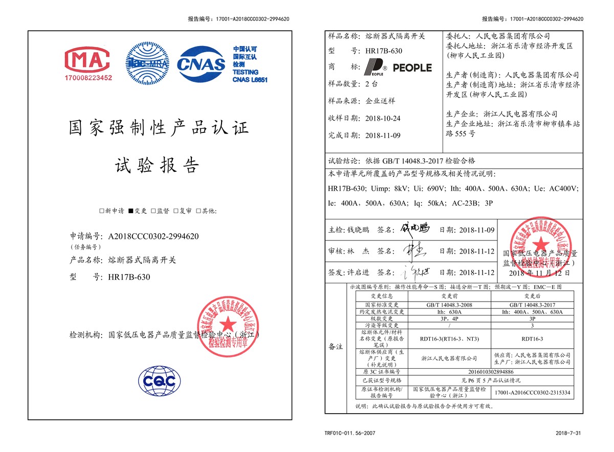 CCC试验报告(201811):HR17B-630熔断器式隔离开关(点击下载)
