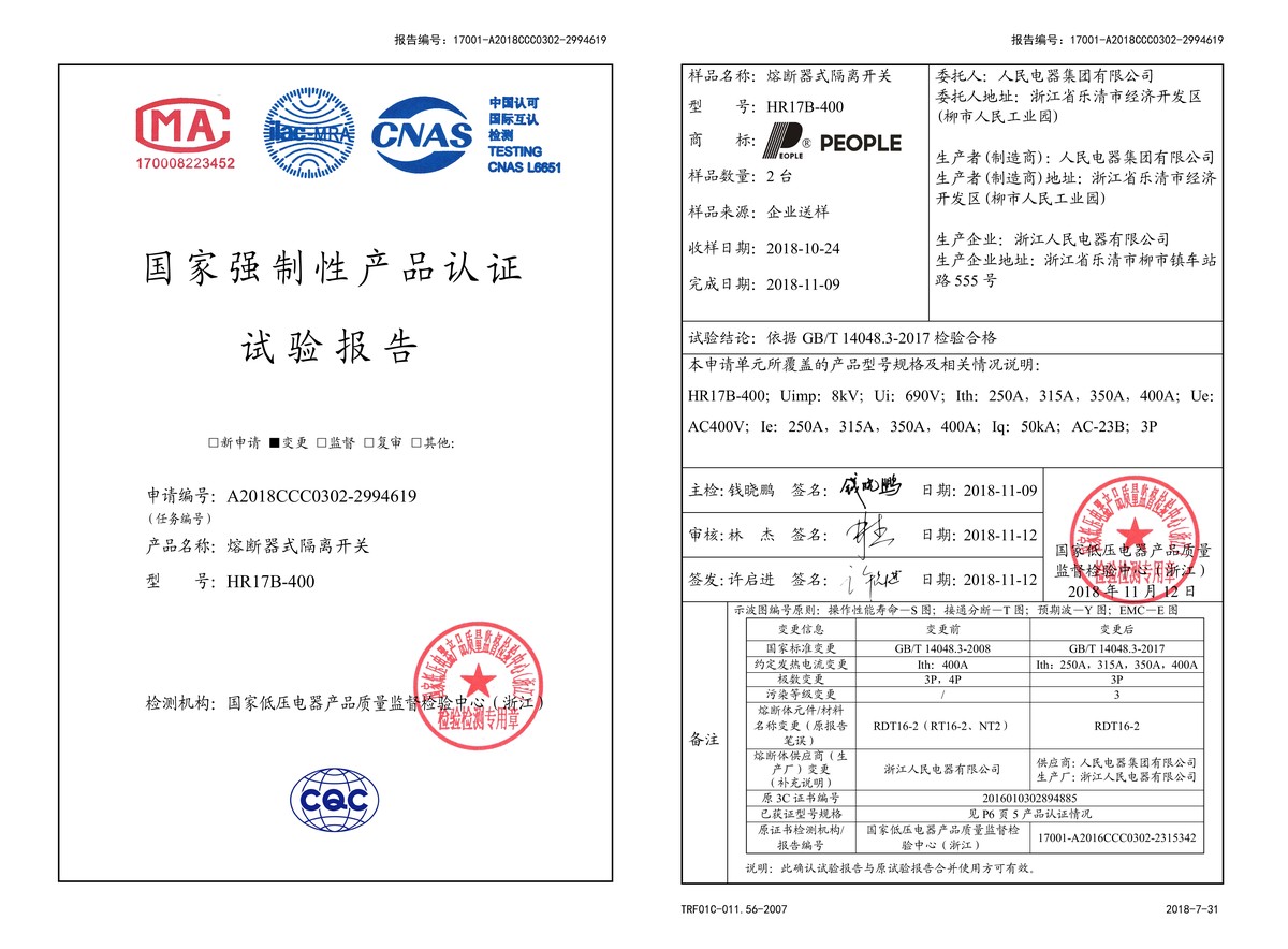 CCC试验报告(201811):HR17B-400熔断器式隔离开关(点击下载)