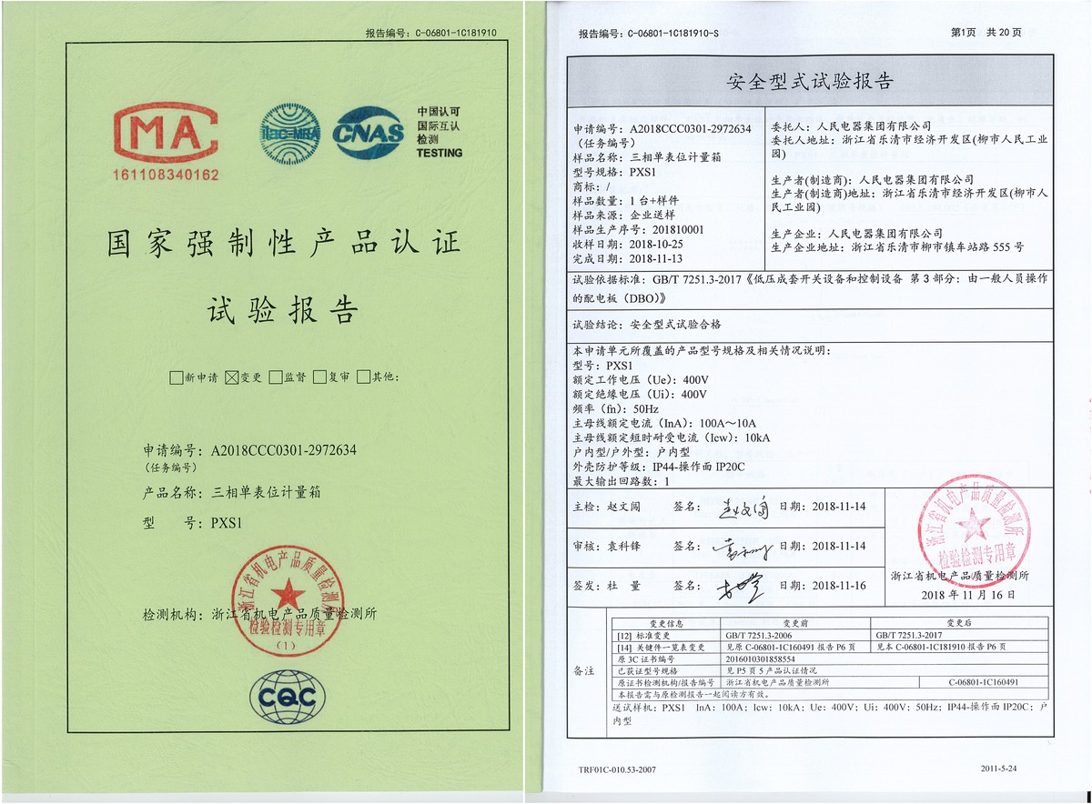 CCC试验报告(201811):PXS1三相单表位计量箱(点击下载)