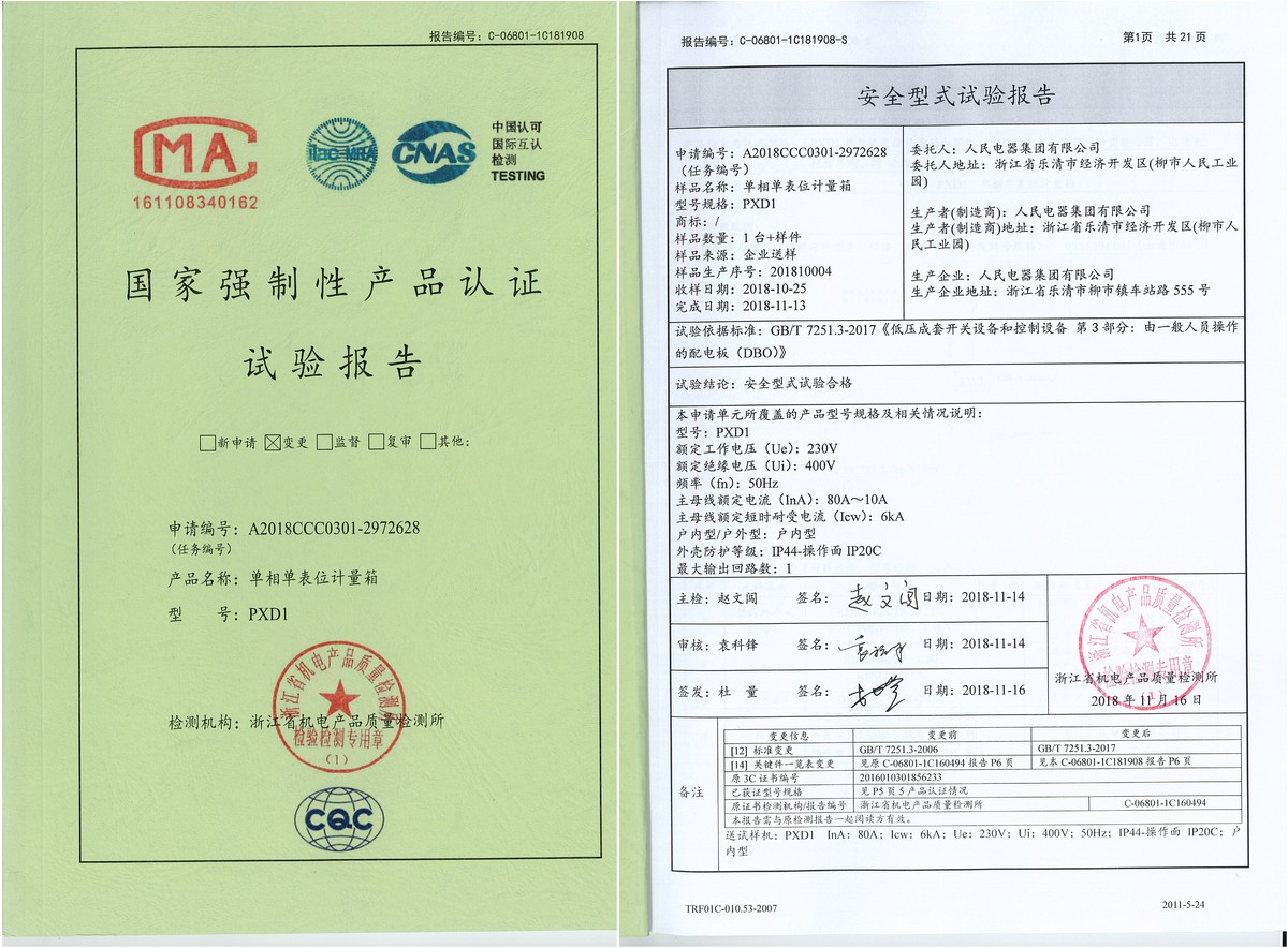 CCC试验报告(201811):PXD1单相单表位计量箱(点击下载)