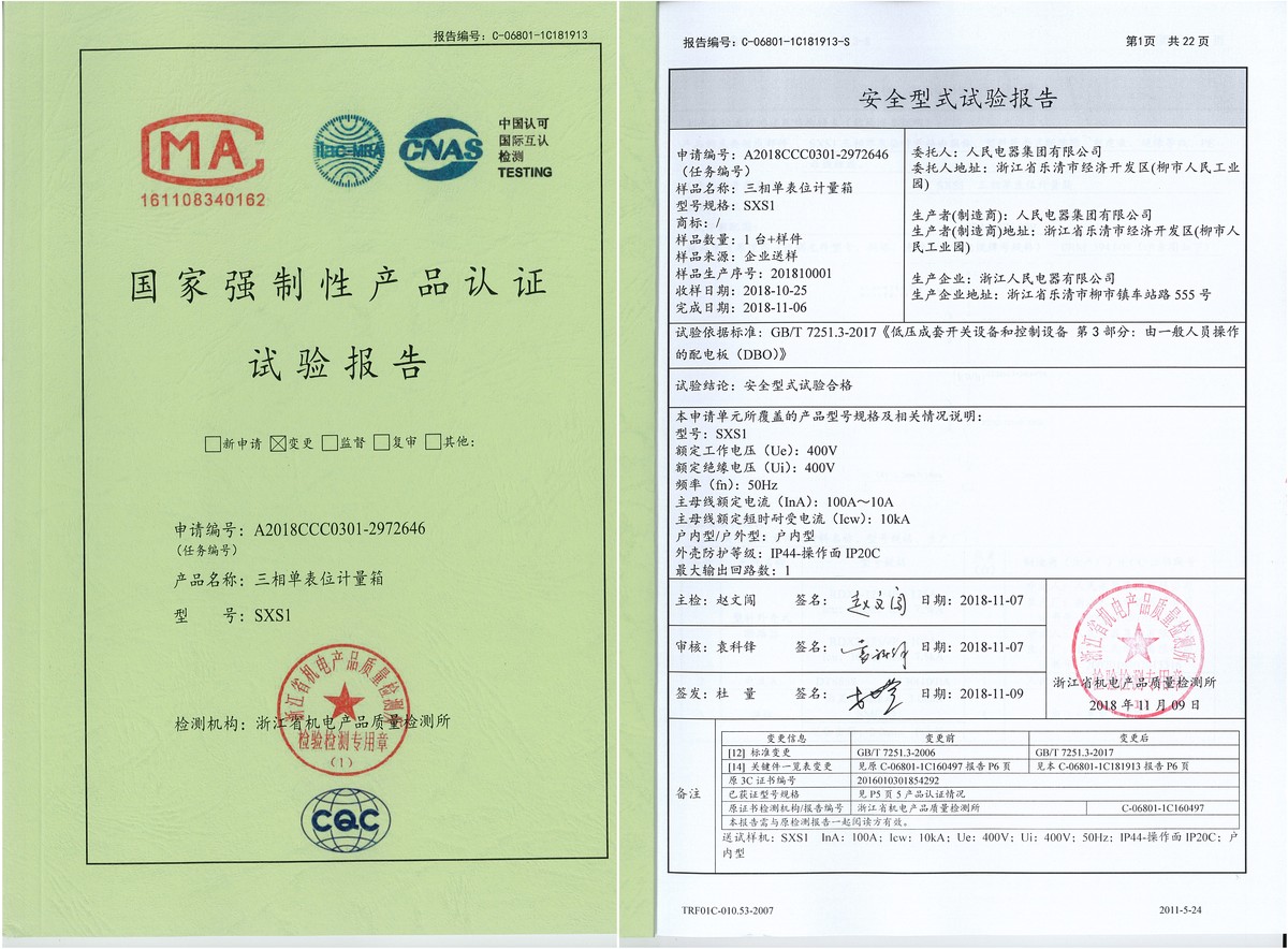CCC试验报告(201811):SXS1三相单表位计量箱(点击下载)