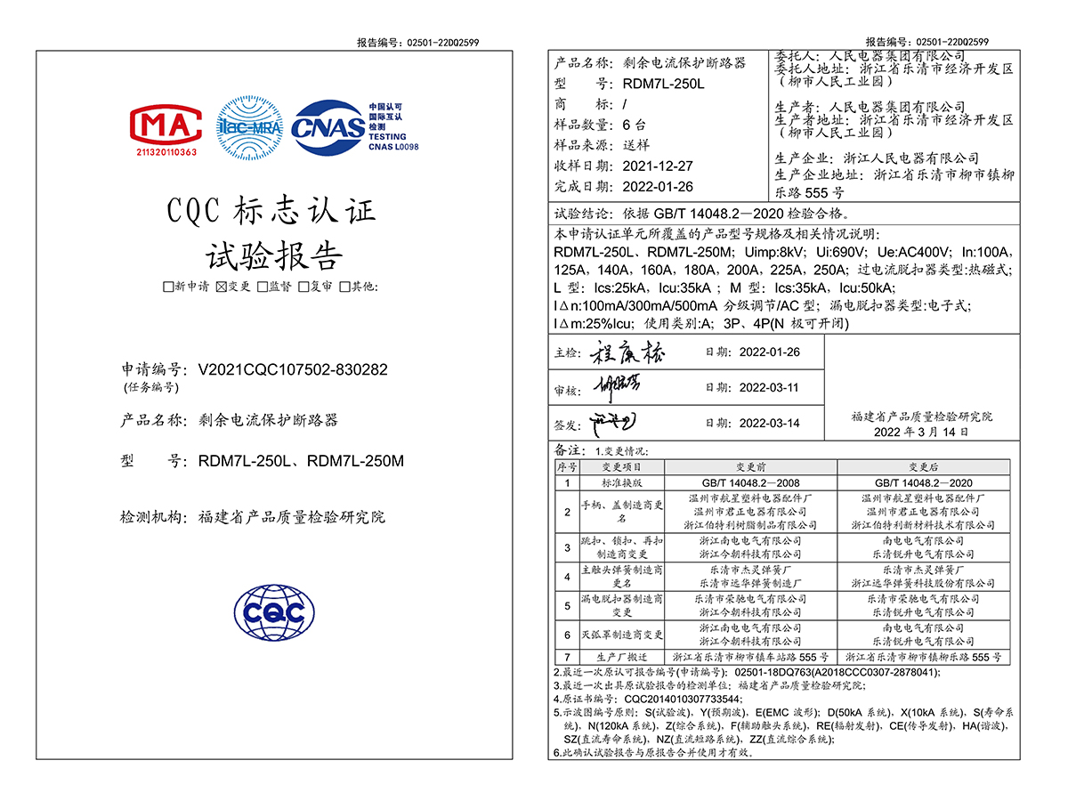 CQC试验报告(202203):RDM7L-250L,RDM7L-250M剩余电流保护断路器(点击下载)