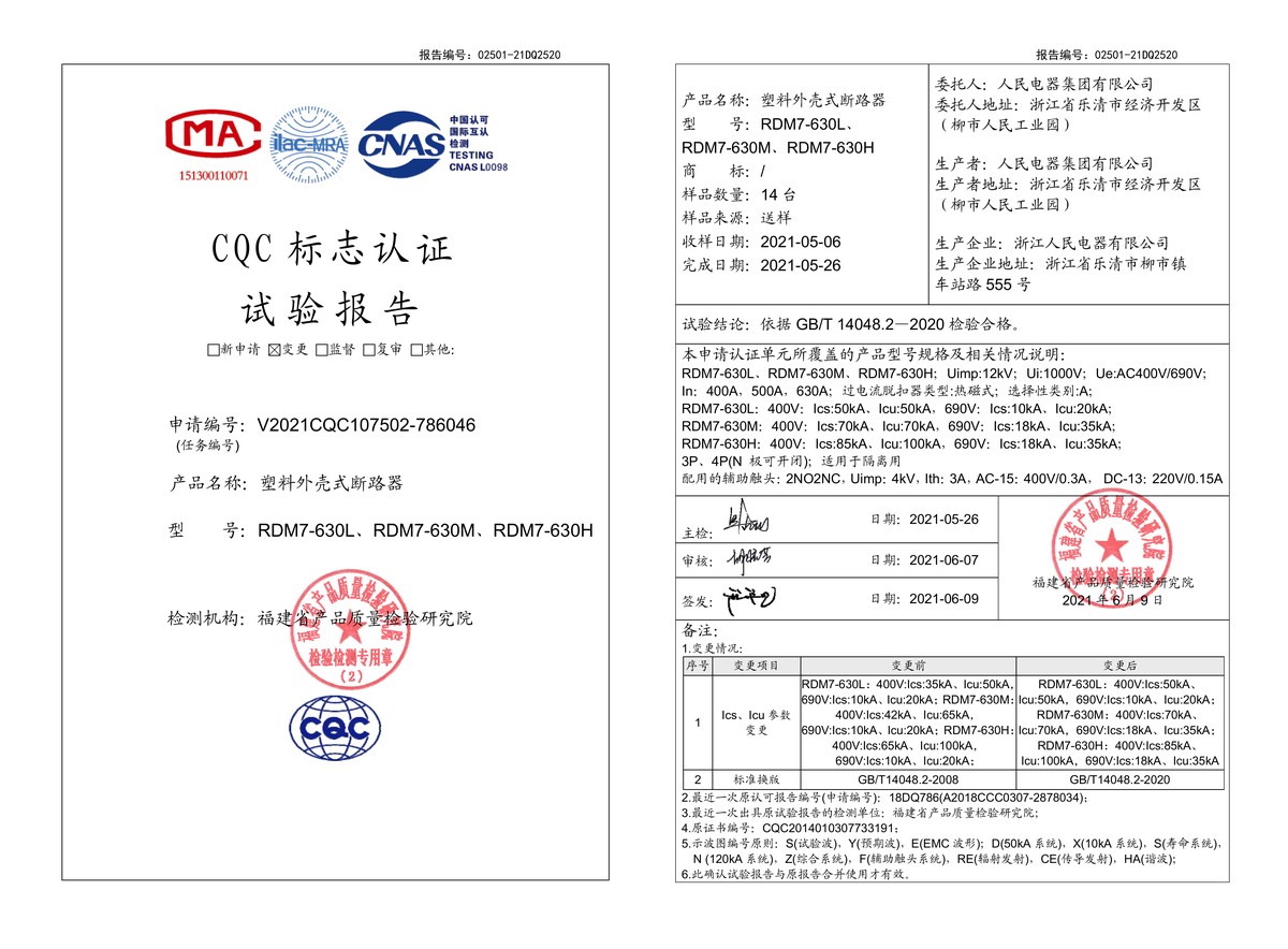 CQC试验报告(202106):RDM7-630L,RDM7-630M,RDM7-630H塑料外壳式断路器(点击下载)