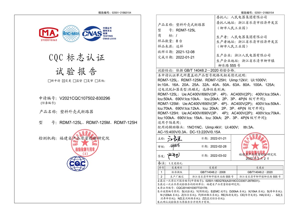 CQC试验报告(202203):RDM7-125L,RDM7-125M,RDM7-125H塑料外壳式断路器(点击下载)