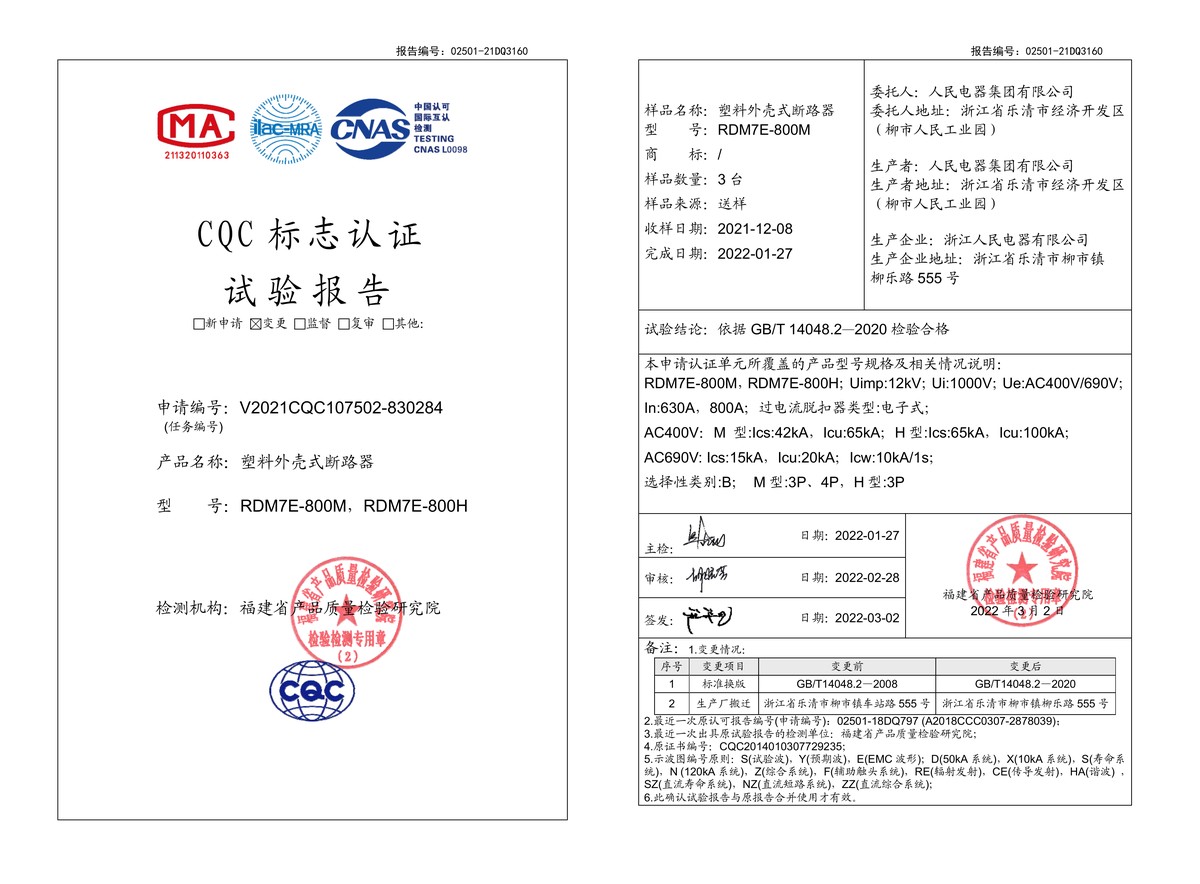 CQC试验报告(202203):RDM7E-800M,RDM7E-800H塑料外壳式断路器(点击下载)